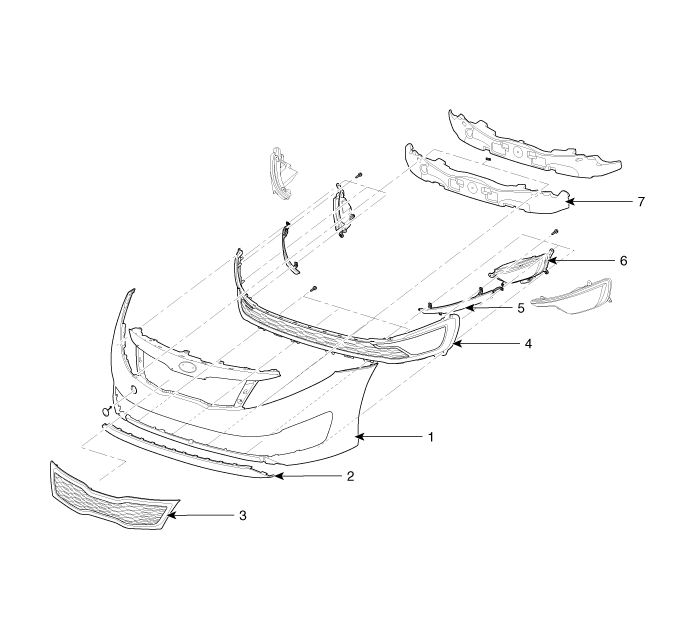 2. Верхняя накладка переднего бампера в сборе 3. Верхняя крышка решетки радиатора 4. Нижний элемент жесткости переднего бампера |
