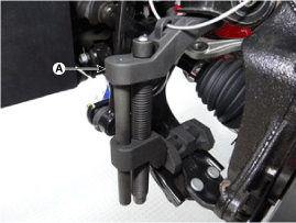Медленно затяните основной болт корпуса (А) и снимите нижний рычаг с переднего поворотного кулака.