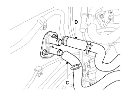 Отсоедините впускной (C) и выпускной (D) шланги отопителя от блока отопителя.