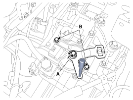 Снятие 1. Отсоедините отрицательную (-) клемму аккумуляторной батареи. 2. С помощью отвертки или съемника снимите боковую крышку подушки безопасности (A). 3. Ослабив крепежные винты, снимите нижнюю панель аварийного щитка (A). 4. Отсоедините разъемы нижнего выключателя (А) подушки безопасности, диагностический разъем (В), подушку безопасности...
