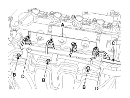 Снимите крепежный болт (D), а затем снимите напорную трубу и форсунку в сборе с двигателя.