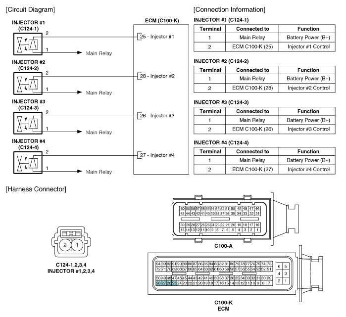 Проверка 1. Выключите зажигание. 2. Отсоедините разъем форсунки. 3. Измерьте сопротивление между клеммами 1 и 2 форсунки. 4. Убедитесь, что сопротивление соответствует спецификации. ...
