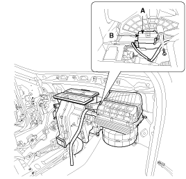 Осмотр 1. Снимите верхнюю крышку кожуха. (Обратитесь к стеклоочистителю) 2. Отсоедините разъем антиобледенителя ветрового стекла (A) от тяги электродвигателя стеклоочистителя. 3. Проверьте целостность цепи между клеммами линий антиобледенителя. 4. Включите зажигание и включите обогреватель ветрового стекла, затем измерьте напряжение между ...