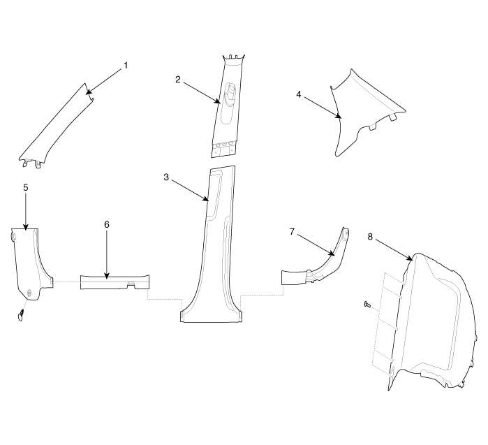 2. Верхняя обшивка центральной стойки 3. Нижняя обшивка центральной стойки 4. Облицовка задней стойки |