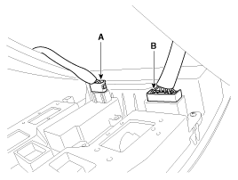 Отсоедините разъемы выключателя люка (А) и выключателя фонаря (В), затем снимите блок фонаря потолочной консоли.