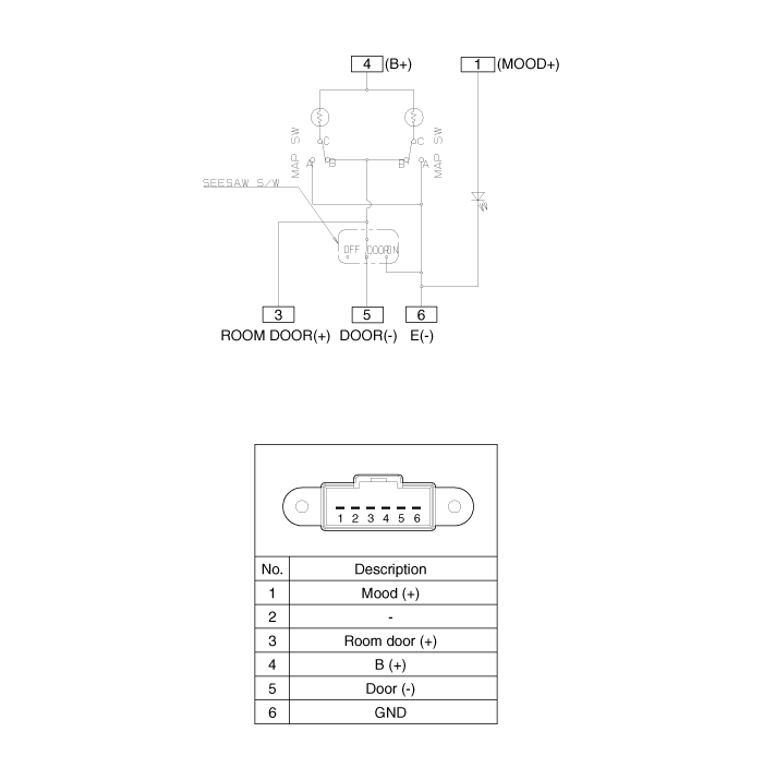 Осмотр Снимите узел лампы потолочной консоли, затем проверьте целостность цепи между клеммами. Если непрерывность не соответствует указанной, замените переключатель лампы карты. Снятие 1. Отсоедините отрицательный (-) ...