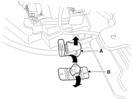 Снятие 1. Отсоедините отрицательную (-) клемму аккумуляторной батареи. 2. Снимите крышку умной распределительной коробки. 3. Снимите узел бокового переключателя аварийной подушки (A), как показано на рисунке ниже. Наденьте перчатки, чтобы...