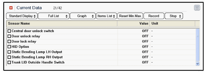Выберите «Текущие данные», если вы хотите проверить текущие данные системы дверного замка с электроприводом. Он обеспечивает состояние ввода/вывода SJB.