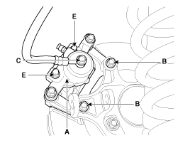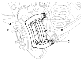 Замените прокладку колодки (D), фиксаторы колодки (C) и тормозные колодки (B) в держателе суппорта (A).