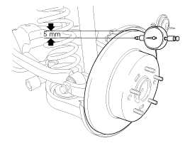 Поместите циферблатный индикатор примерно в 5 мм (0,2 дюйма) от внешней окружности тормозного диска и измерьте биение диска.