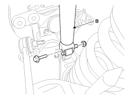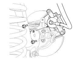 Снимите крепежные болты тормозного суппорта , а затем удерживайте тормозной суппорт в сборе (B) проволокой, как показано на рисунке.