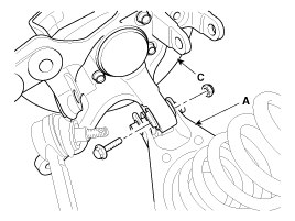 Ослабьте болты крепления нижнего рычага (А) и задней стойки (В) и снимите узел поворотного кулака (С).