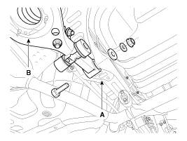 Ослабьте болт и гайку и снимите задний нижний рычаг (В) с подрамника (А).