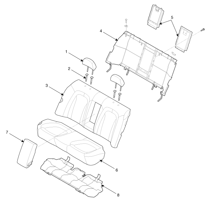 2. Направляющая подголовника 3. Обивка спинки заднего сиденья 4. Рама спинки заднего сиденья в сборе |