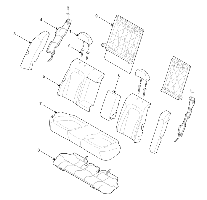 7. Чехол на подушку заднего сиденья. 8. Каркас подушки заднего сиденья в сборе 9. Каркас спинки заднего сиденья в сборе |