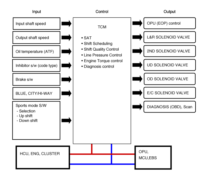 Расположение компонента [Компонент установки автомобиля] 1. Автоматическая коробка передач2. Модуль управления коробкой передач (TCM)3. Рычаг переключения передач4. Разъем канала передачи данных (DLC) [Компонент установки коробки передач] 1. Датчик входной скорости2. ...
