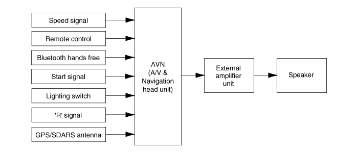 Расположение компонентов 1. AVN (головное устройство аудио/видео и навигации)2. Среднечастотный динамик 3. Внешний усилитель4. Антенна на крыше (GPS + SDARS)5. Динамик в передней двери6. Задний динамик7. Низкочастотный динамик8. Кабель питания антенны9. ...