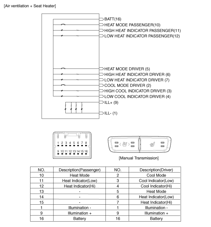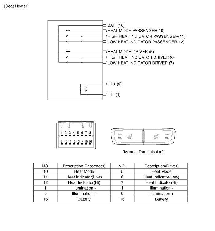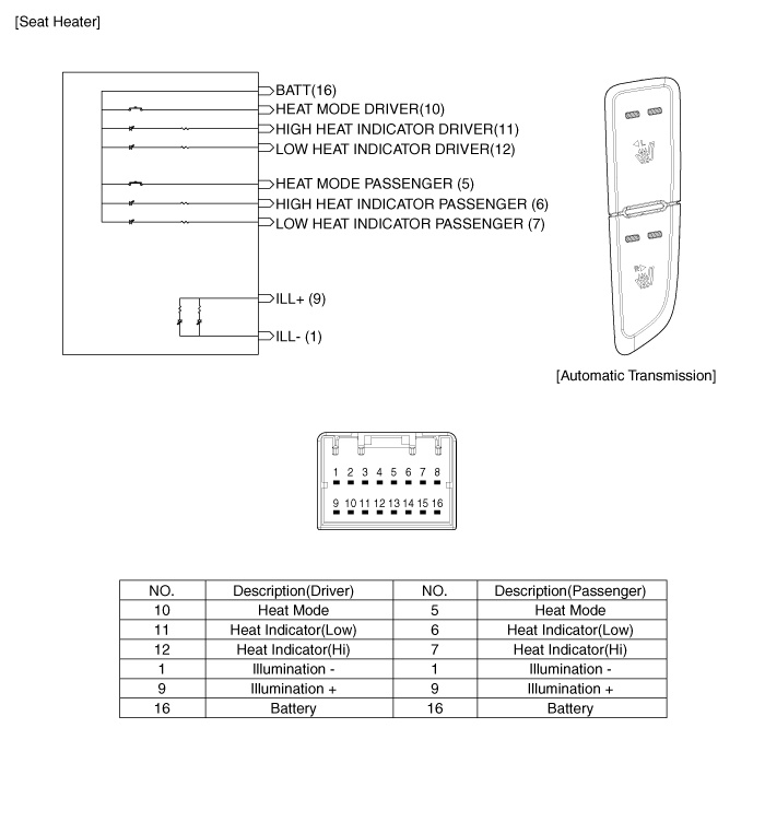Проверка Когда переключатель сиденья с электроприводом находится в каждом положении, убедитесь в наличии непрерывности между клеммами, расположенными ниже. Если непрерывность не соответствует указанной, замените переключатель сиденья с электроприводом. A: Управление сиденьями с электроприводом...