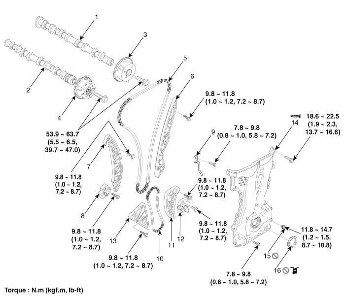 12. Натяжитель цепи уравновешивающего вала 13. Направляющая цепи уравновешивающего вала 14. Крышка цепи ГРМ 15. Болт сервисного отверстия 16. Передний сальник коленчатого вала |