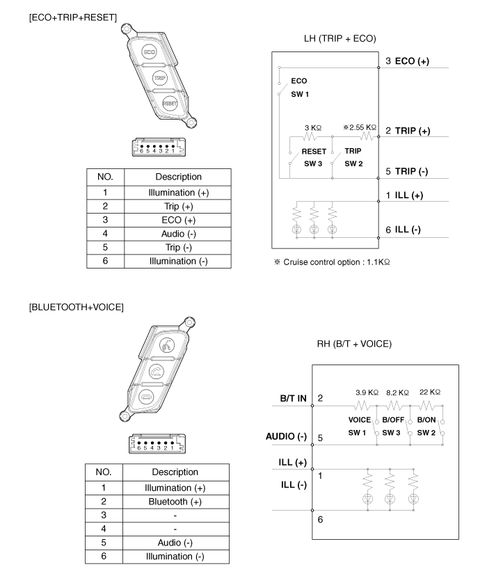 Проверка 1. Проверьте переключатель дистанционного управления аудиосистемой на наличие сопротивления между клеммами в каждом положении переключателя. [Отключение + Сброс] ПереключательКонтакт разъемаСопротивление (±5%)Сброс3 - 5 (ЛВ)5,54 кОмОтключение3 - 5 (ЛВ)2,54 ...