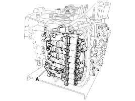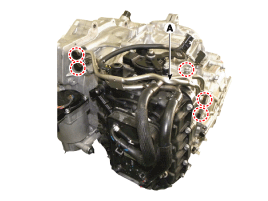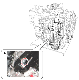 Снимите шланг подогревателя ATF (A), а затем снимите крышку блока клапанов (B).