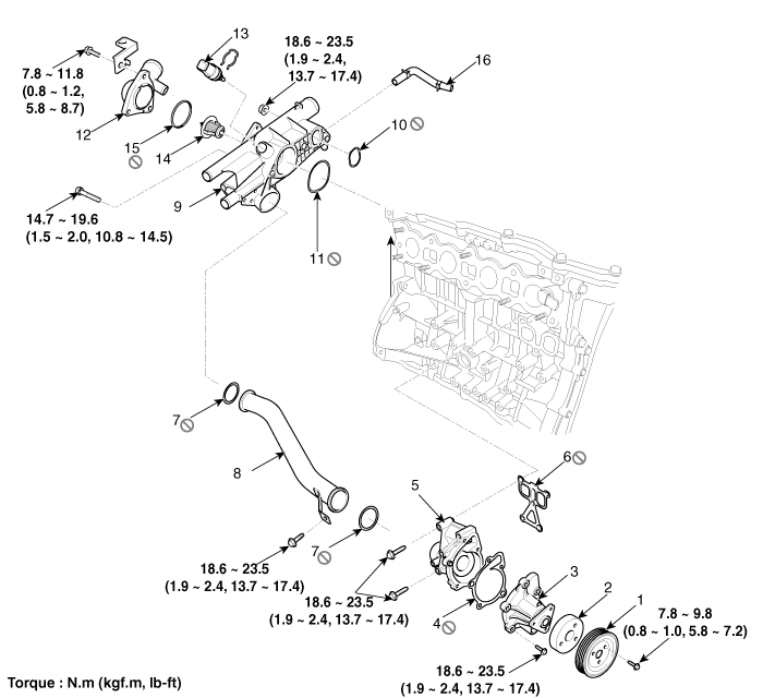 14. Термостат 15. Прокладка термостата 16. Шланг охлаждающей жидкости корпуса дроссельной заслонки. |