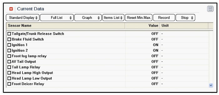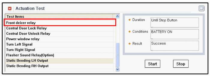 Чтобы проверить входное значение переключателя антиобледенителя ветрового стекла в принудительном режиме, выберите опцию «Проверка срабатывания интеллектуальной распределительной коробки».