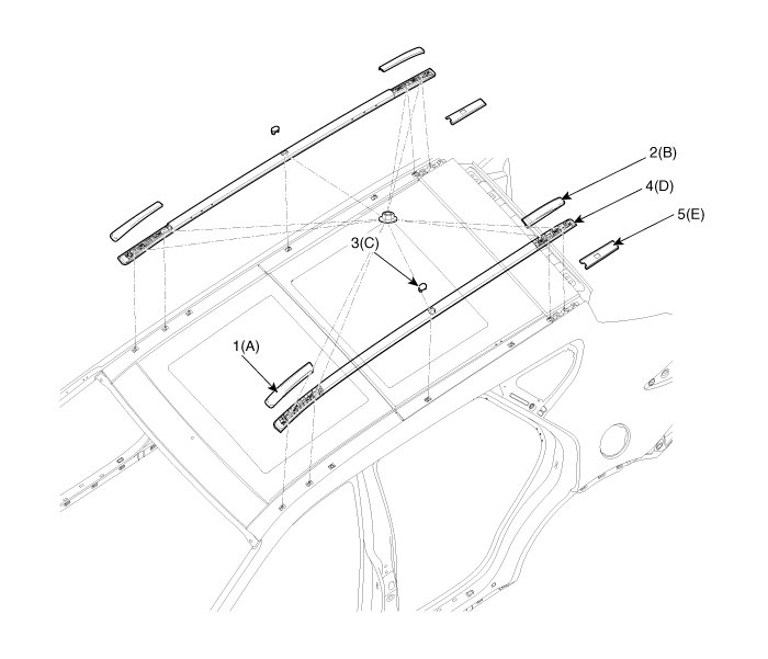 Снимите передний молдинг крыши (Е) и задний молдинг крыши (F).
