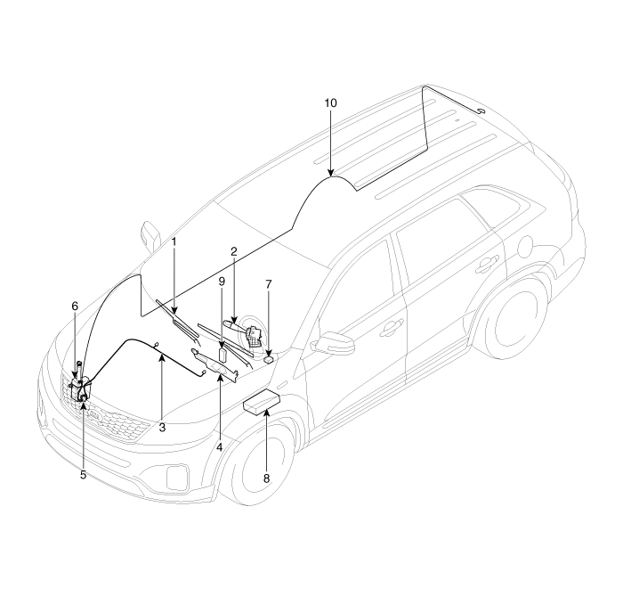 XM второго поколения (2011-2023 гг.) / Kia Sorento XM 2011-2023 Руководство по ремонту / Электрическая система кузова / Стеклоочиститель/омыватель ветрового стекла / Расположение компонентов