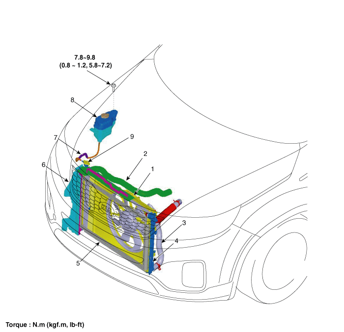 7. Переливной шланг 8. Резервуар 9. Крышка радиатора |