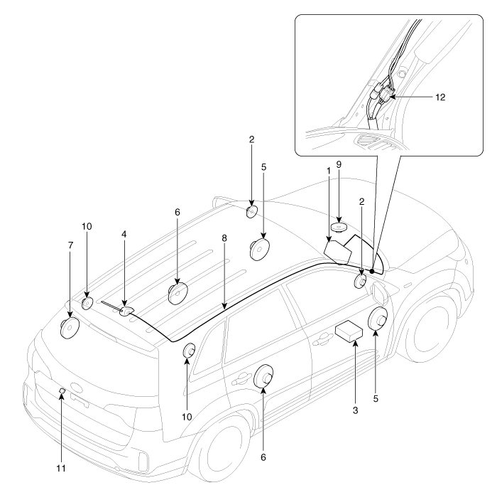 XM второго поколения (2011-2023 гг.) / Kia Sorento XM 2011-2023 Руководство по ремонту / Электрическая система кузова / Система АВН / Расположение компонентов
