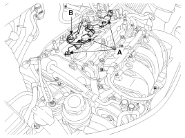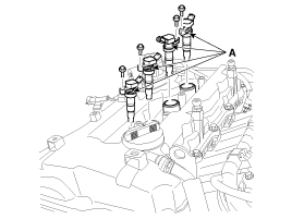 Отсоедините разъем удлинителя форсунки (А) и разъемы катушки зажигания.