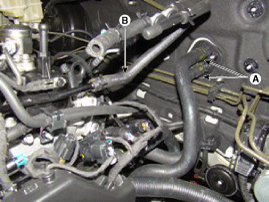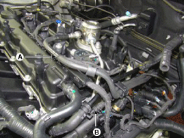Отсоедините топливный шланг (А) и PCSV (электромагнитный клапан управления продувкой).
