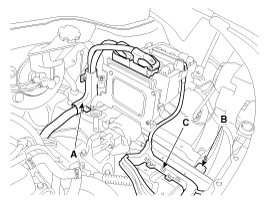 жгута проводов (B) и аккумулятора (+) (C) после ослабления болтов и