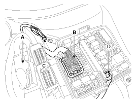 Отсоедините разъемы ECM (A), передний жгут проводов (B), массу.