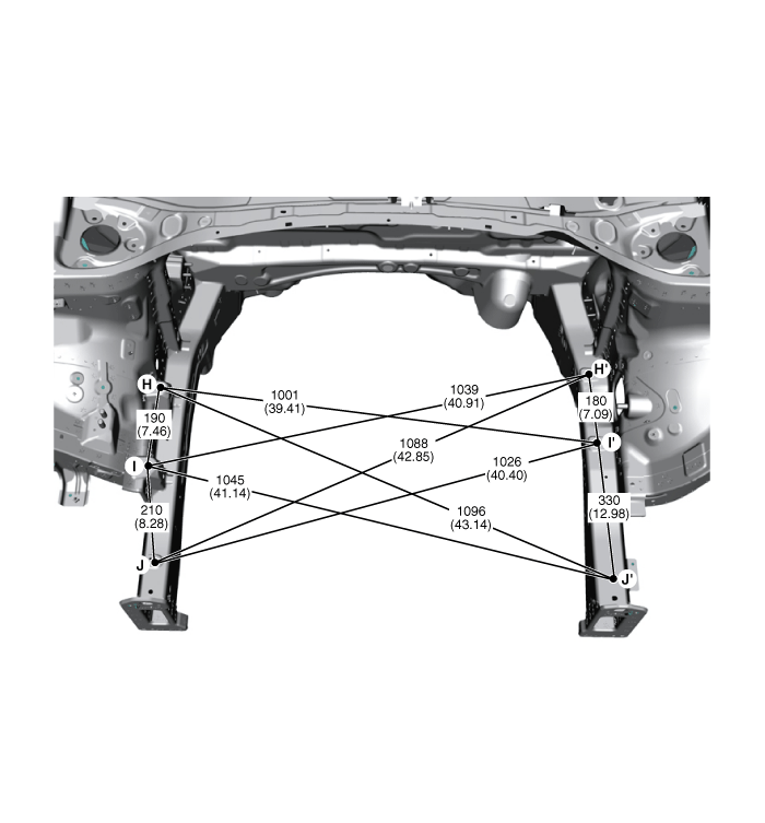 XM второго поколения (2011-2023 гг.) / Kia Sorento XM 2011-2023 Руководство по ремонту / Кузов (внутри и снаружи) / Размеры корпуса / Передняя часть кузова E