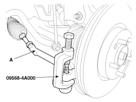 Отсоедините шаровой шарнир (А) от поворотного кулака с помощью специального инструмента.