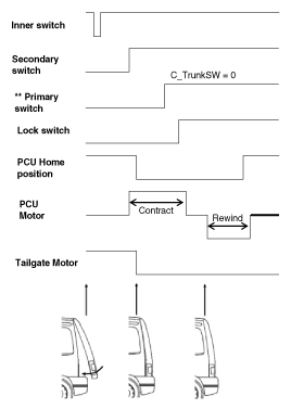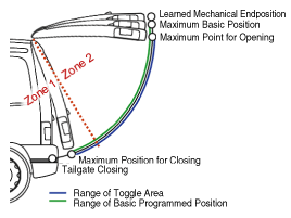 Закрытие может быть запущено после получения сигнала от консольного (водительского) переключателя, переключателя на внешней ручке, дистанционного ключа (FOB), внутреннего переключателя.
