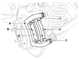 Замените прокладку колодки (D), фиксаторы колодки (C) и тормозные колодки (B) в