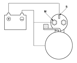 Подсоедините батарею, как показано на рисунке. Если шестерня стартера выскакивает, он работает правильно.