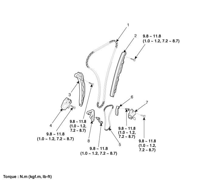Kia Sorento: Timing Chain Components - Timing System - Engine Mechanical System - Kia Sorento XM 2011-2023 Service Manual Kia Sorento: компоненты цепи ГРМ