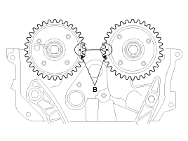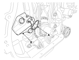 Установите звездочку цепи коленчатого вала (В) и масляный жиклер цепи привода ГРМ.