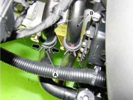 Отсоедините шланг охлаждающей жидкости (B) после снятия шланга охлаждающей жидкости.