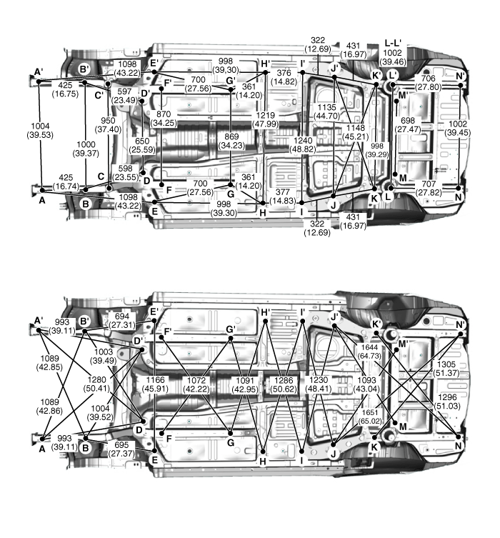 XM второго поколения (2011-2023 гг.) / Kia Sorento XM 2011-2023 Руководство по ремонту / Кузов (внутри и снаружи) / Размеры корпуса / Под кузовом (2WD)