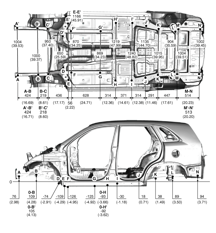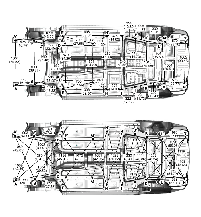 XM второго поколения (2011-2023 гг.) / Kia Sorento XM 2011-2023 Руководство по ремонту / Кузов (внутри и снаружи) / Размеры корпуса / Под кузовом (4WD)