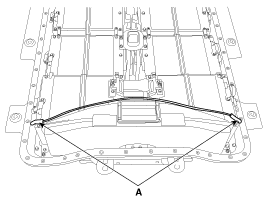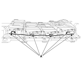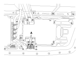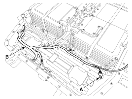Отсоедините положительный (+) источник питания управления системой обогрева высоковольтной батареи и разъем заземления (А).