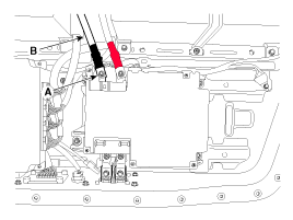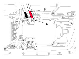 Ослабив крепежную гайку (A), отсоедините положительный (+) силовой кабель высокого напряжения (B).