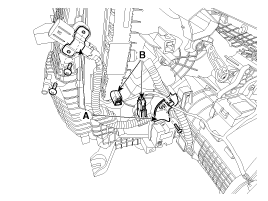 Снимите блок отопителя и вентилятора (А) с защитной накладки (В), предварительно ослабив крепежные гайки.