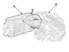 Отделите блок вентилятора (А) от блока обогревателя (В) после ослабления крепежных винтов (С).