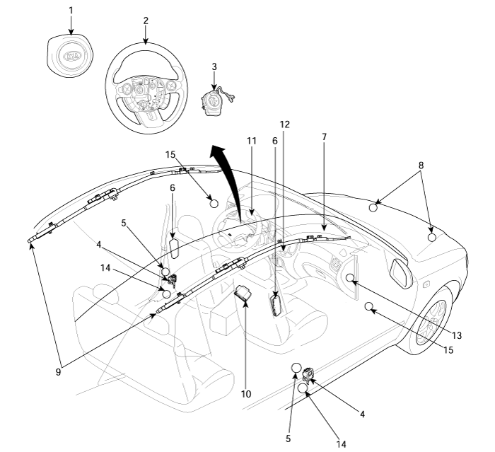 2. Рулевое колесо 3. Часовая пружина 4. Преднатяжитель ремня безопасности (BPT) 5. Датчик бокового удара (SIS) 6. Боковая подушка безопасности (SAB) 7. Подушка безопасности пассажира (PAB) |